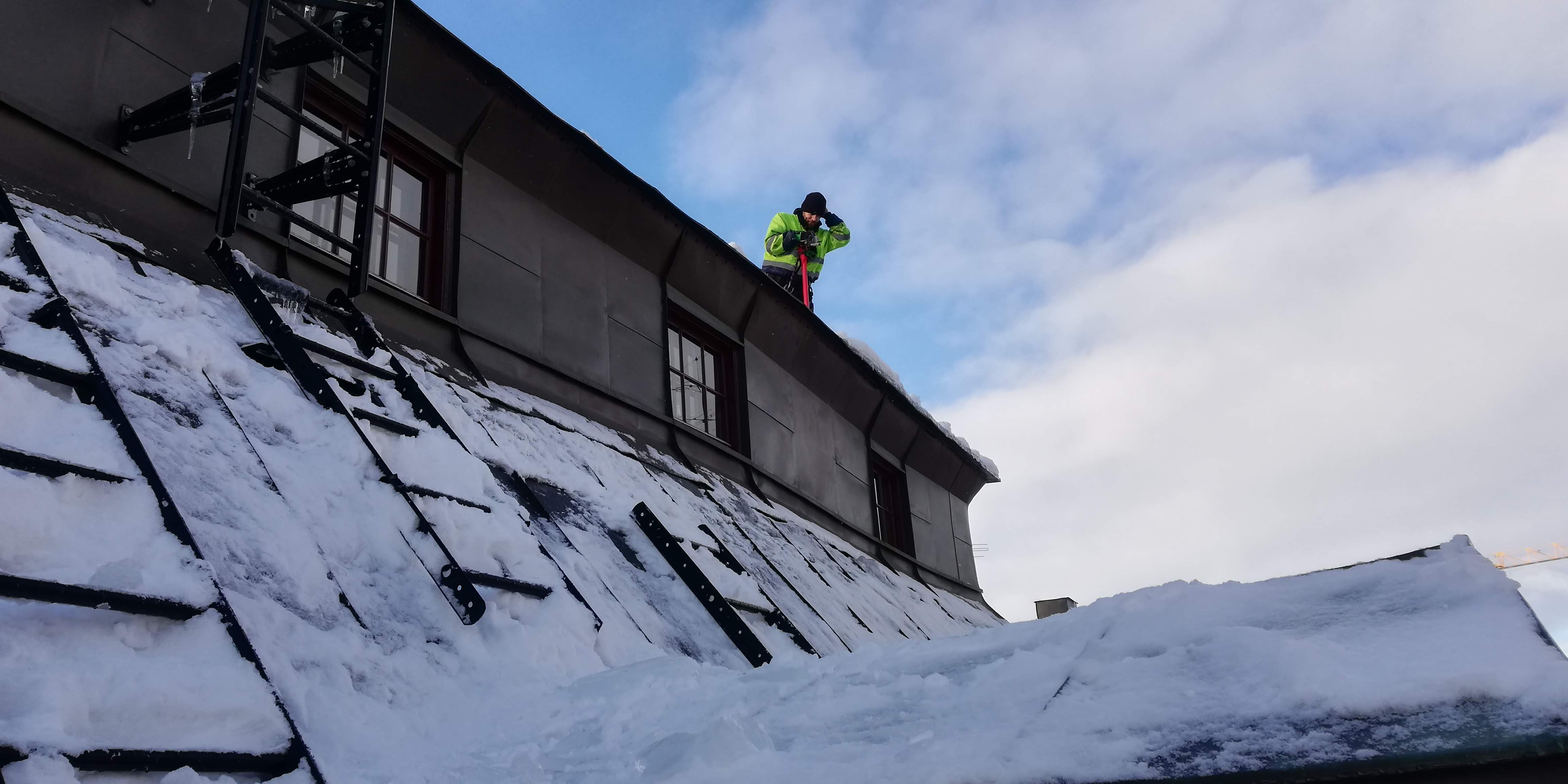 När snön bygger på och köldgraderna håller i sig kan ytorna nedanför taket behöva säkras från fallande snö och is. Vi gör det genom att på ett säkert vis ta ned snö och is som riskerar att rasa. Detta med personal licensierad enligt skotta säkert. Skottning utförs med erforderliga avspärrningar och "vakter".